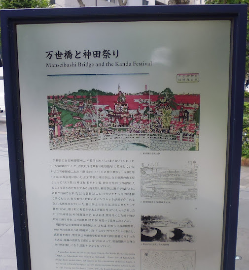江戸時代、南側の神田須田町側には、筋違門(すじかいもん)<(13)参照>があり、明治時代にその門を壊して東京最初の石橋「万代橋 (よろずよばし) 」を架橋。1930年コンクリート橋にかけかえた時に「万世橋」と名づけ、のちに「まんせいばし」と呼ぶようになった。とのこと。